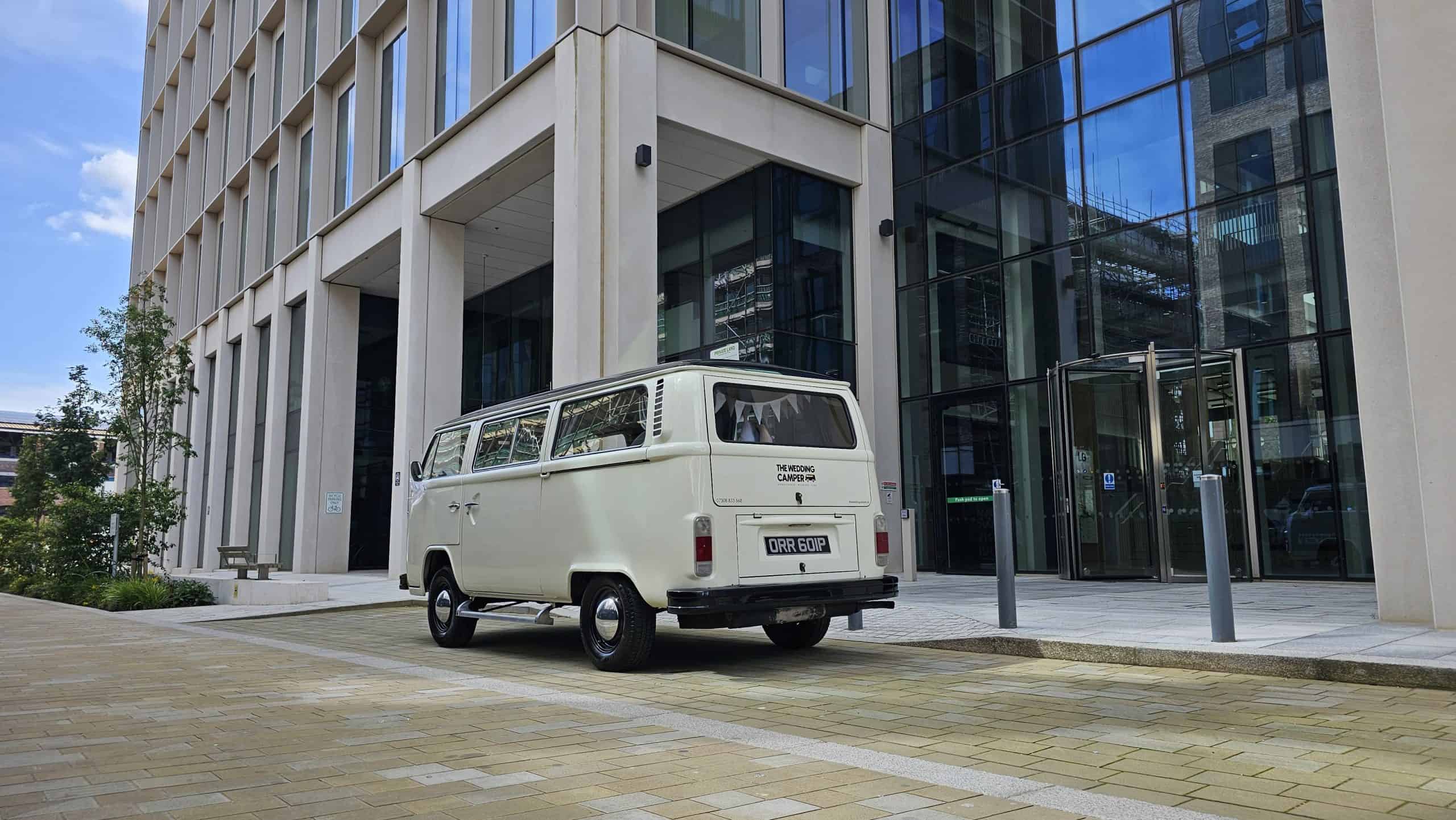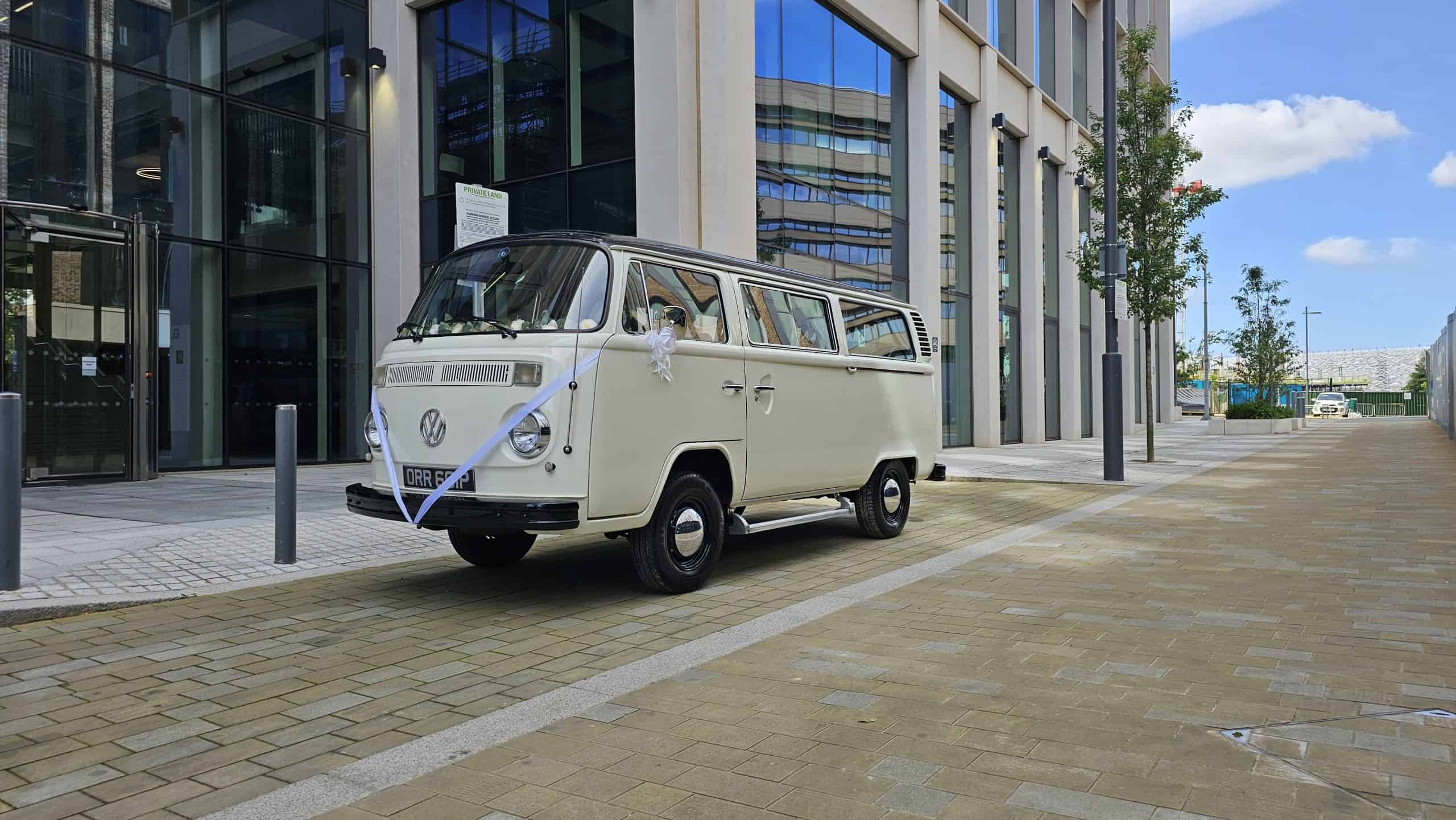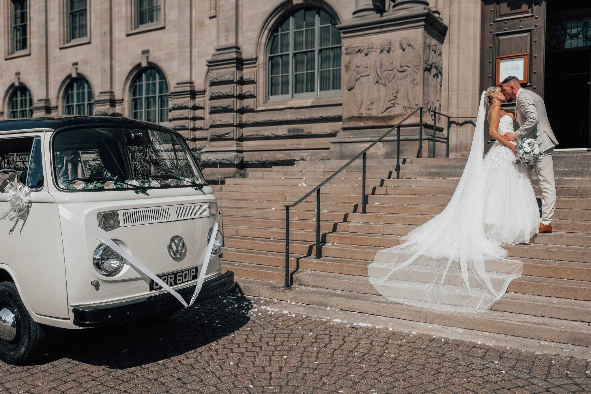The pair opted for our popular package deal, featuring the best of both worlds: the charming vintage VW Campervan and the sophisticated Chrysler 300c. The groom, Anthony, and his groomsmen arrived in sleek style, chauffeured to the Town Hall in the modern, luxurious Chrysler. Meanwhile, the bridesmaids and the bride, Nicola, travelled in the fun and iconic VW Campervan, ensuring a memorable entrance for all parties.