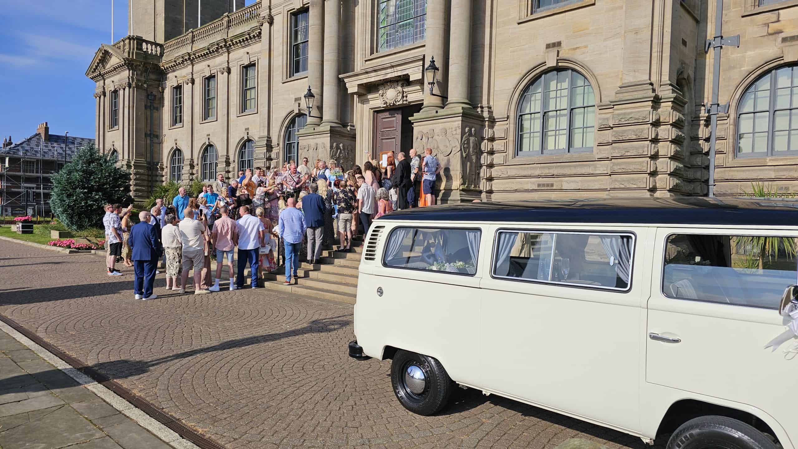 South Shields Town Hall provided a beautiful backdrop for the marriage of Anthony and Nicola today, a celebration highlighted by the couple's choice of dual wedding transport.